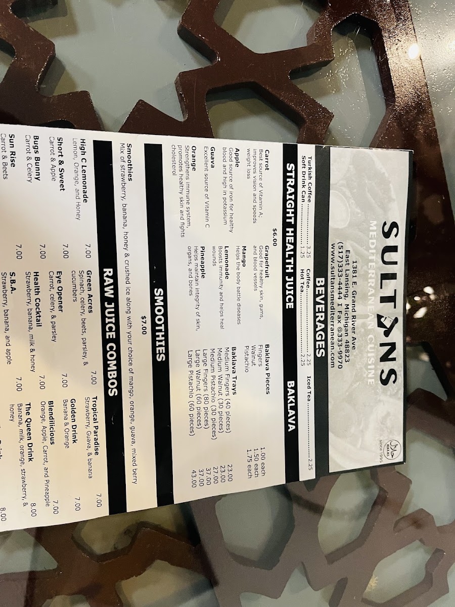 Welcome to Sultan's Restaurant - East Lansing, a gem located at 1381 E Grand River Ave. This establishment specializes in authentic Mediterranean cuisine that delights the senses. The menu offers a variety of non-vegetarian combinations, such as the tender Chicken Shawarma Combo and exquisite Lamb Kabob Combo, each packed with rich flavors and accompanied by their signature tahini sauce.